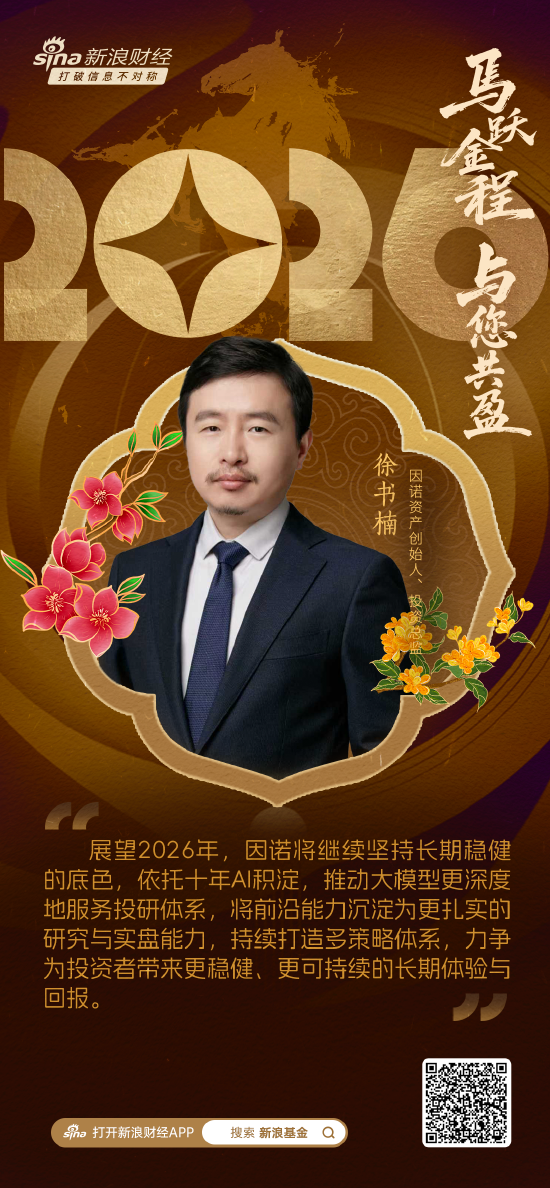 因诺(上海)资产管理有限公司创始人、投资总监徐书楠送来新春祝福。他表示,展望2026年,因诺将继续坚持长期稳健的底色,依托十年AI积淀,推动大模型更深度地服务投研体系,将前沿能力沉淀为更扎实的研究与实盘能力,持续打造多策略体系,力争为投资者带来更稳健、更可持续的长期体验与回报。新的一年,愿大家行稳致远、马到功成。